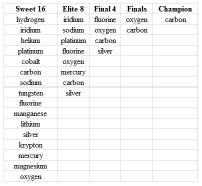I certainly made sure to recognize the elements that made it to the Sweet 16, the Elite 8, and the Final 4. Perhaps one or more of your favorite elements earned on of these honors (Table 1).