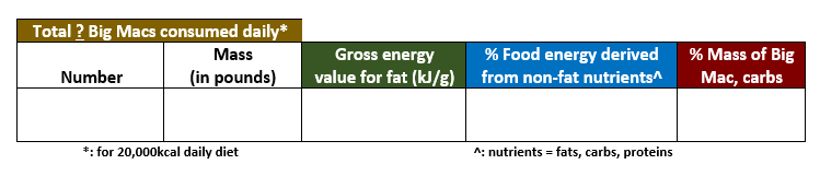 Answers (left to right in table above): 37 [(20,000kcal/day)/(540kcal/Big Mac)]; 17.5lbs (37 Big Macs x 215g/Big Mac x 1lb/454g); 37.2kJ/g (= 8.9kcal/g = 250kcal from fat/28g fat where 4.18J/cal); ~54% [(energy from carbs + proteins)/total energy) = (total energy - energy from fats)/total energy = {(540 - 250)/540}Cal x 100]; and 21.4% [(mass carbs/total mass Big Mac) x 100 = (46g carbs/215g Big Mac) x 100].