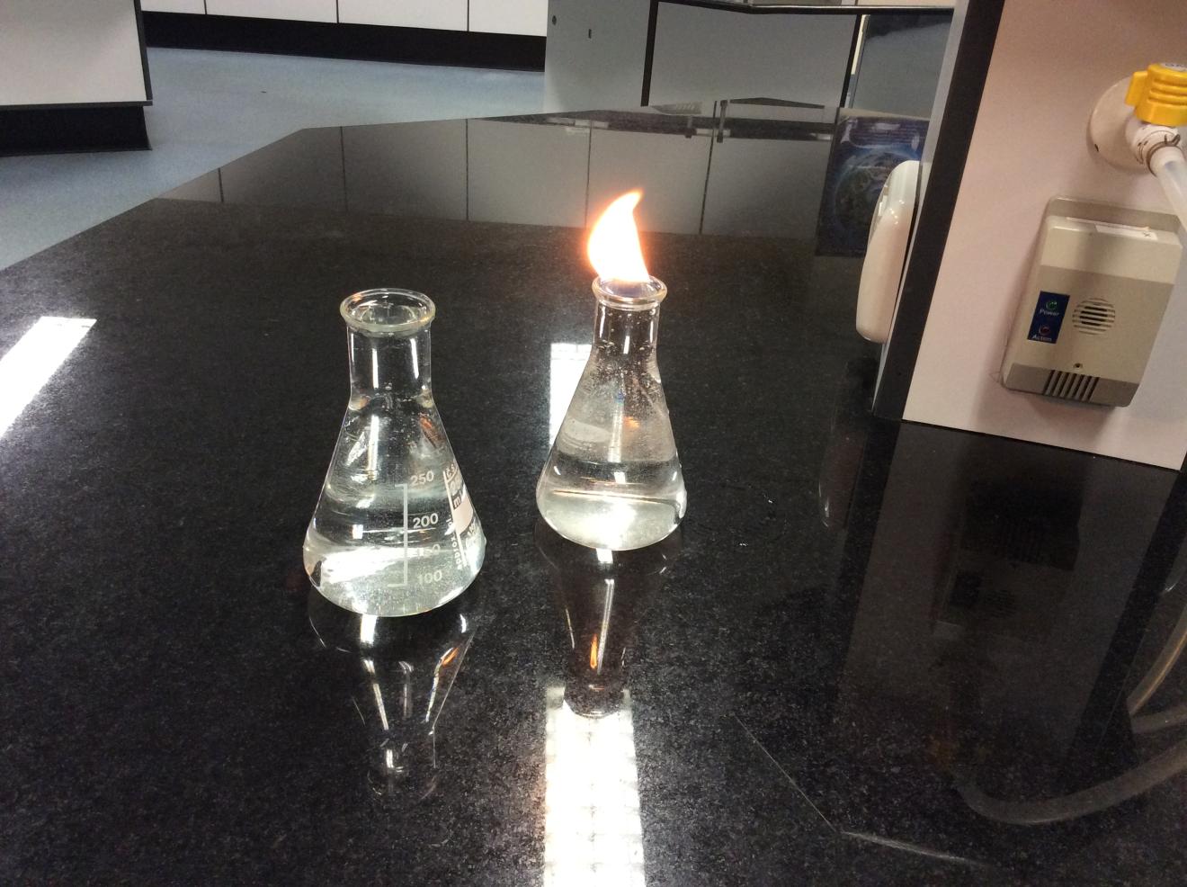 After that I placed about 1 mL on top of a flask full of water. And lo and behold, only one of the samples burned!