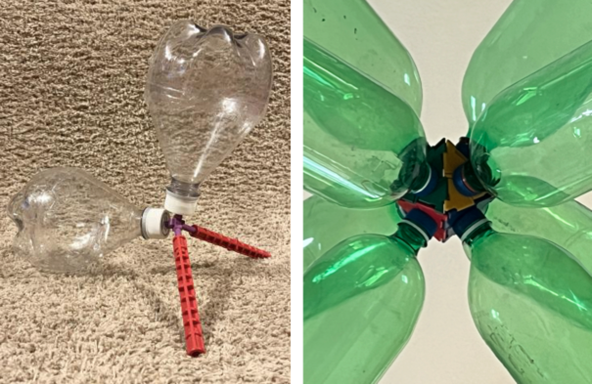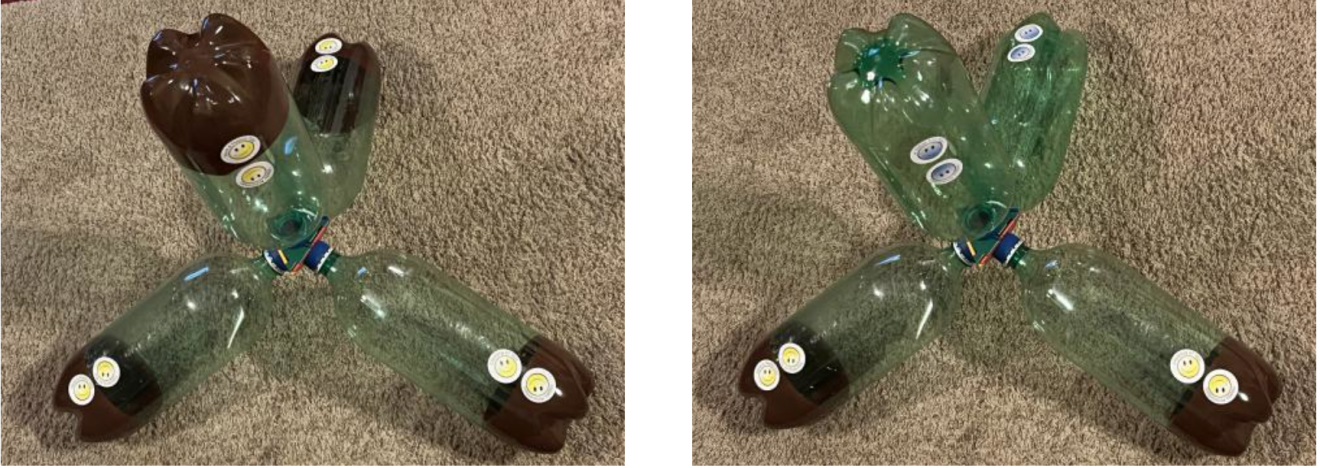 Figure 1 shows the various bottle cap clusters used to connect to and direct the orientation of the plastic bottles. The leftmost connector is a wooden cube with a cap on each square face, and the bottles that are connected to these caps adopt an octahedral arrangement with 90° angles between them. In the middle of Figure 1 is a wooden triangular prism with a cap on each square and triangular face, and the bottles that are connected to these caps adopt a trigonal bipyramidal arrangement with 90° and 120° angles between them. Cutting a tetrahedron from wood is a little more complex, since there are no 90° angles in the structure, but not impossible. An alternative explored in this work was the Polydron building set.3 This building set consists of plastic plates in the shapes of triangles, squares, and pentagons, that can be assembled along their edges to build three-dimensional shapes. At right in Figure 1 is a tetrahedron with a cap on each triangular face (the structure has been opened to show details about its construction). The bottles that are connected to these caps adopt a tetrahedral arrangement with 109.5° angles between them.