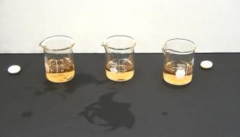 Congratulations to Grazyna Zreda who solved the Chemical Mystery of the Mentos candies! To conduct this trick, two white Mentos candies are placed in separate beakers that both contain universal indicator. One of the Mentos candies turns the indicator slightly green, indicating the presence of base. The other Mentos candy turns the indicator red, indicating the presence of acid. The trick is that one of the candies is a regular mint Mentos (which contains no citric acid), while the other is a fruit Mentos (which does contain citric acid). The outer, colored layer of the fruit Mentos is removed prior to the experiment. When this is done, the fruit Mentos looks very much like a regular white mint Mentos.
