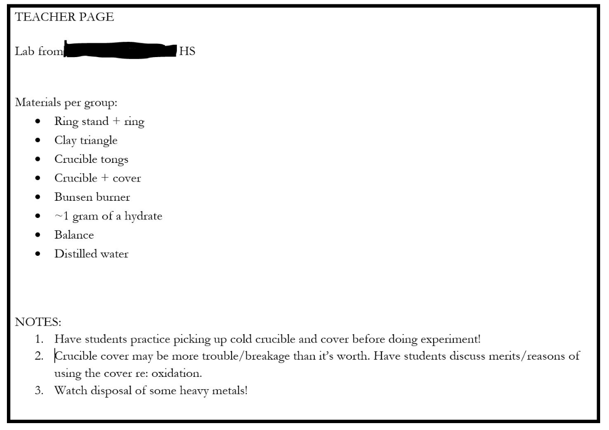 Figure 1 - My Teacher Page for Determining the Formula of a Hydrate Lab