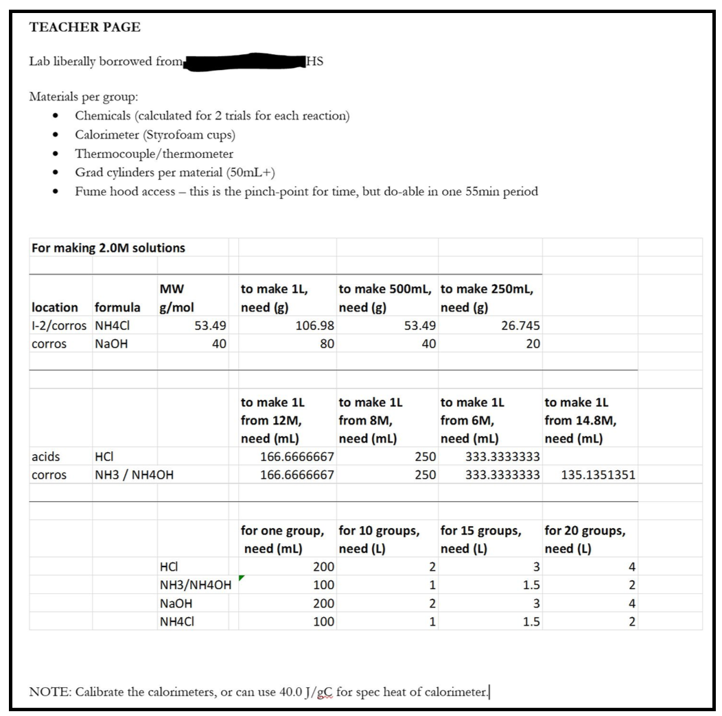 The Formula of a Hydrate Lab (Fig. 1) is a pretty simple Teacher Page (although the lab itself is not!) It’s nothing mind-blowing; just a list (easier than reading through the procedure and missing things) of everything to check before lab. There’s not a whole lot for me to set up before students get to lab, no solution prep, but there’s a reminder for me to tell my students at the beginning of class. You can see a slightly more complicated set-up for me, a thermochemistry lab that needs four solutions of a specific molarity in Figure 2 below.