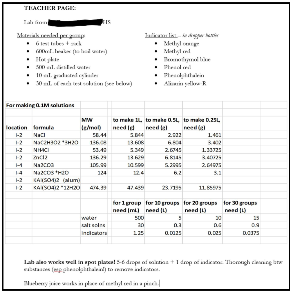 The Teacher Page for my Hydrolysis Lab (Fig. 3) is more clear: materials, mixing solutions, and materials needed per groups of students. And yes, frozen blueberries saved the day!
