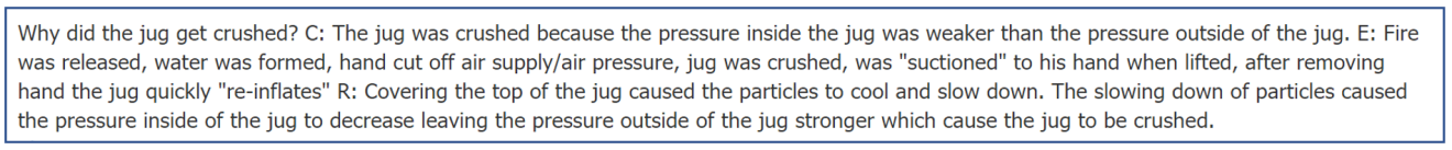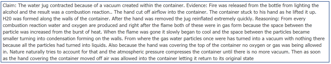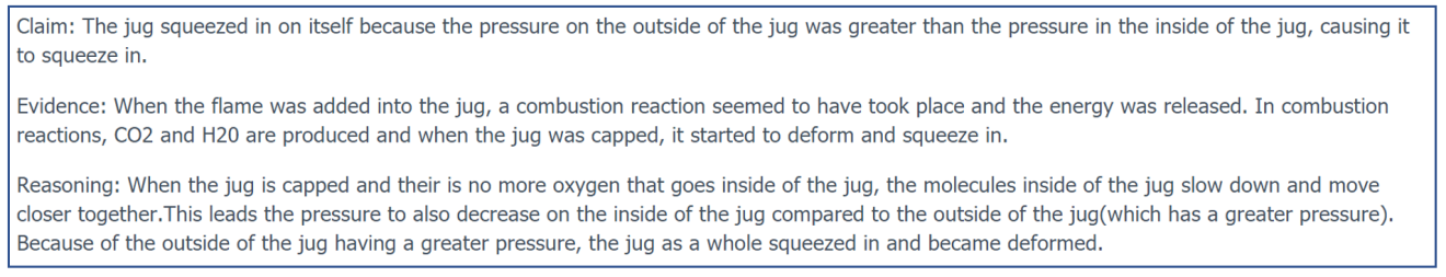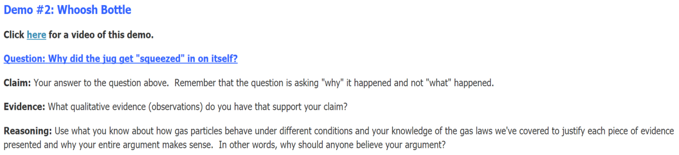 Though I hadn’t originally planned on creating an extension to this demo, I thought it made sense take advantage of the opportunity and make the most out of their vulnerable curiosity by creating an improvised Claim, Evidence, Reasoning activity. Basically, students were tasked with constructing a scientific explanation for the demo based on their still-limited knowledge of gas laws and atmospheric pressure. By the next period, I had made a more formalized activity and posted it to our LMS (Schoology) in the form of a discussion thread. In doing so, students were able to collaborate on their potential explanations and, once posted to the discussion forum, were able to see other explanations from their classmates.