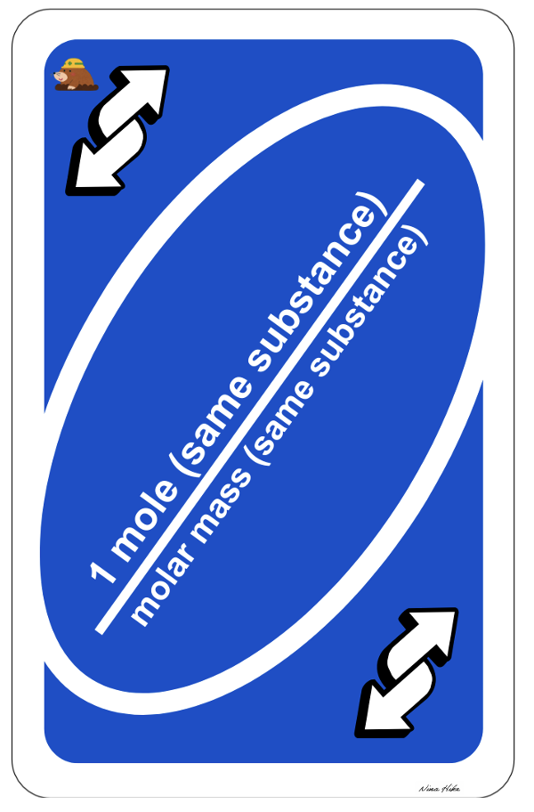 In the next class, students walk in, and I tell them to play UNO. They are initially shocked and hesitant but start to play and even teach other students how to play, so I give them time to get comfortable playing UNO. I asked students to explain how to play it, such as what happens with the UNO reverse and wild cards. Then, I show students the UNO conversions, aka mole conversions cards. We discuss that the molar mass conversion factor is 1 mol (same substance) = grams (molar mass) (same substance), which the blue UNO reverse card will represent. We also discussed that students can reverse the molar mass conversion factor. 1 mole can be on top (numerator) and molar mass on the bottom (denominator), but it must be the same substance. Avogadro conversion factors are on the green UNO reverse card, and Volume at STP 22.4 L = 1 mole is on the yellow UNO reverse card. The UNO wild card works well as the mole-to-mole conversion factor because, in UNO, you can use it to change to different colors, so students can use it to convert to other substances for mole conversions. It also explicitly reminds students that the moles come from the coefficients in the balanced chemical equation.