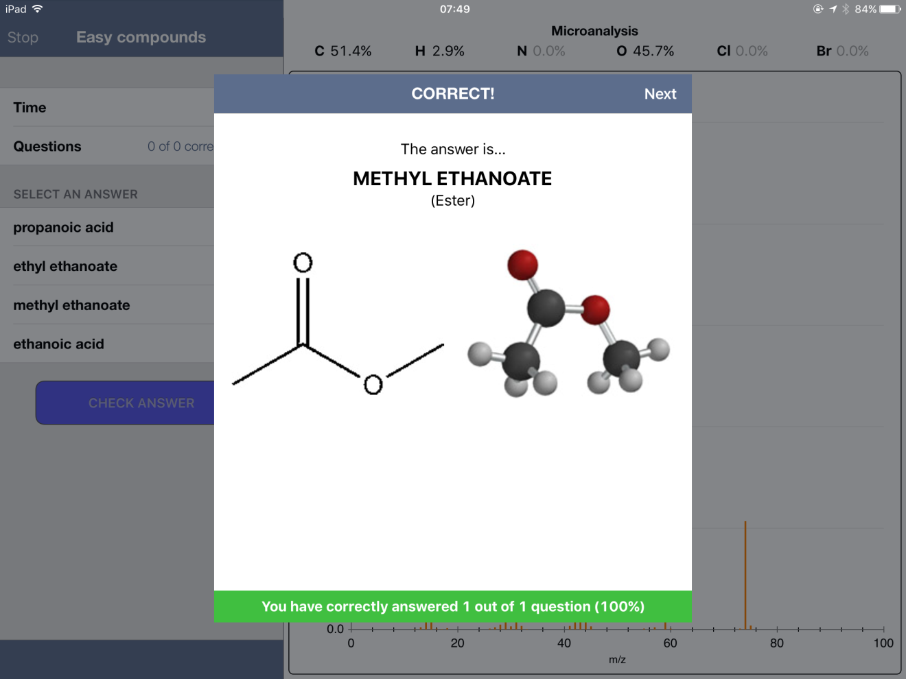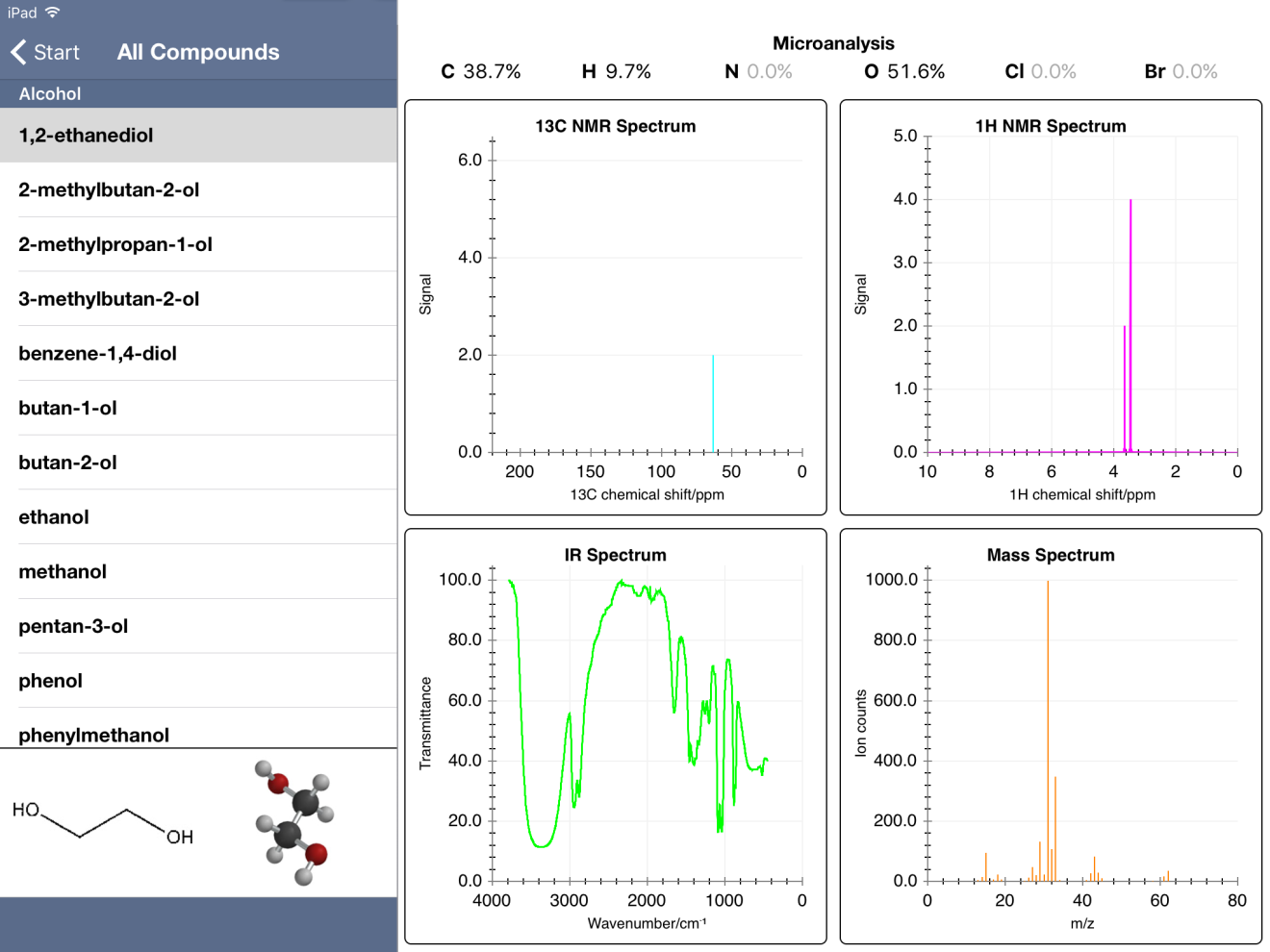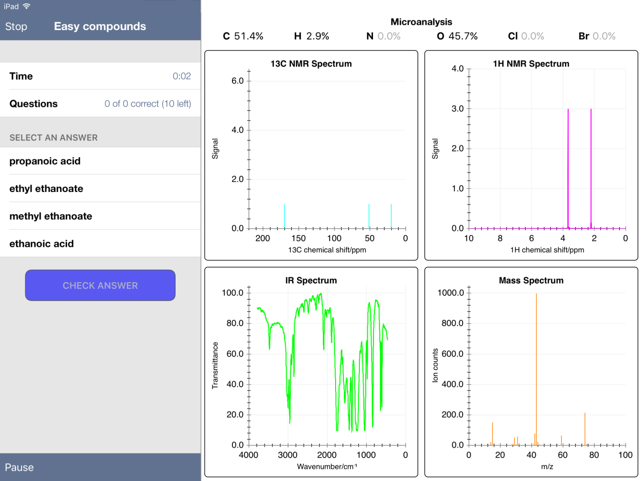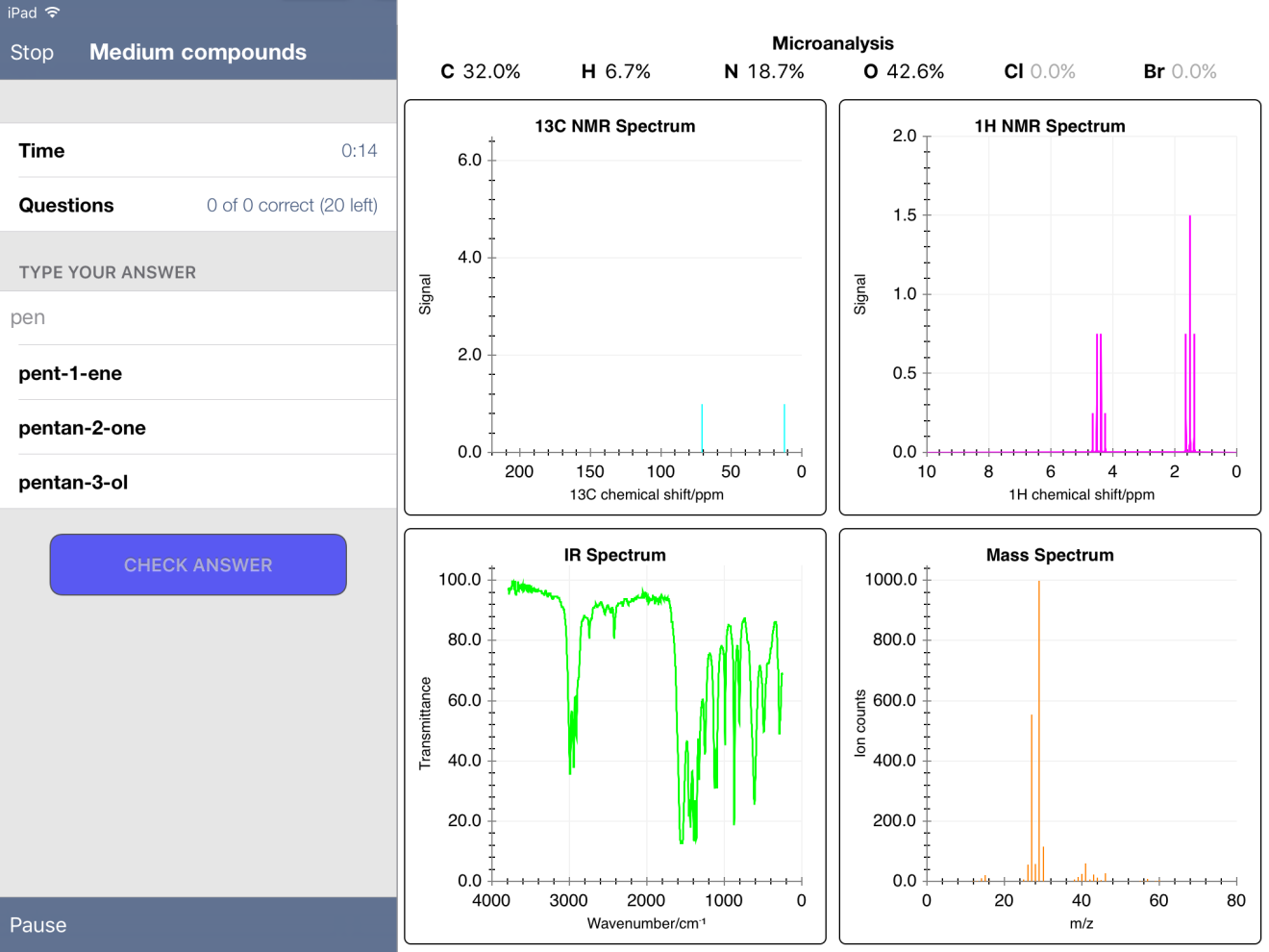 On the recommendation of a coworker at my current school, I tried the FREE iPad app "Chemical Detectives." (Link HERE to the app.) The app has quiz mode, offering the user percent composition, C-13 NMR, 1H NMR, MS and IR spectra. In "easy" mode, the user selects from four possible compounds. In "medium" and "hard" modes, the user must type in the name. The compounds stored in the database pop up as you type. For example, for one compound that I thought was pentanone, I started typing "pen…" and got the following: