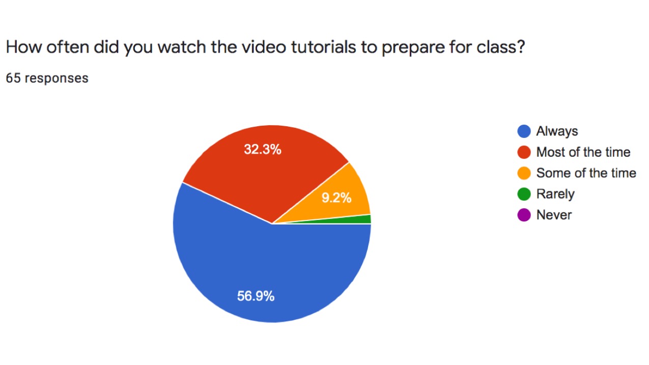 Since I employ a flipped classroom, I was particularly interested in how my students are using available resources to gather knowledge, and if any barriers or limitations exist. Moreover, I wanted to learn how much time my students were working outside of class since flipped classes can be more time consuming than traditional classes.3