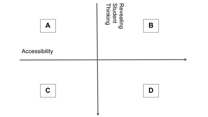 A useful way to visualize the similarities and differences for these formative assessments collectively is on a grid divided into four quadrants, as shown below. Formative assessments would be put onto the grid according to how they varied with regard to their accessibility to a student on the x-axis, and how revelatory they are of students' thinking on the y-axis. Notice how the example formative assessments map out nicely onto the chart, with example 1 (Chemical reaction graph) mapping out onto quadrant A, example 2 (rock density calculation) fitting into quadrant B, example 3 (weather map) aligning with quadrant C, and example 4 (candy question) best fitting into quadrant D. Although all categories of formative assessment have utility at one time or another in our teaching, we at ACCT propose that teachers strive to revise formative assessments to move them toward quadrant D in order to ensure that formative assessments are accessible, and teachers can gain insight into what the students are thinking.