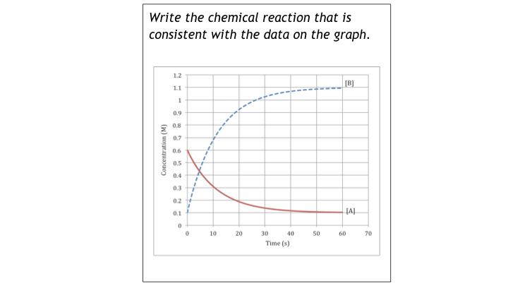As a formative assessment, Example 1 could reveal students' content knowledge regarding mole ratios in a chemical reaction and how to interpret a concentration versus time graph. No further insight regarding what students believe is happening at the molecular scale or why the reactants form products is probed by the question. A student that did not know the relationship between a change in concentration and the mole ratio in the balanced chemical equation would have no access to this question; it would create a barrier that students would not be able to overcome. This type of formative assessment question would be good for reviewing for a standardized test that we would predict to have similar questions. Giving this question to our class would enable us to check on whether students had learned this particular piece of knowledge in a review session.