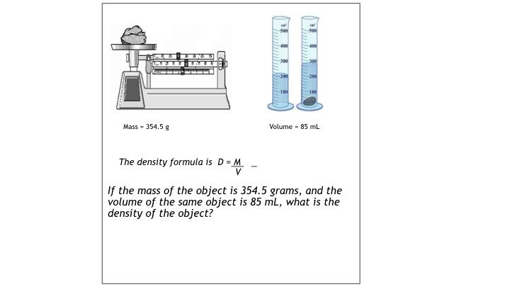 Example 2 is more accessible to students than example 1. This formative assessment has helpful visuals and the formula to solve for density from mass and volume. Both of these components make the formative assessment question accessible to students trying to figure out what the question is asking and how to answer it. Students are clearly led to divide the mass by the volume in order to solve for the density of the rock using the formula density = mass/volume. Despite the higher degree of accessibility, this question still does not reveal anything about what students think about chemistry. A student that answers this question correctly does not do so by sharing their concept of what it means for the structure of a substance to have a high or low density, or about why the water displacement method for determining the volume of an irregularly shaped object is effective. This question would be a good question to give to our students while reviewing for a quiz or test, assuming that our other quiz questions have a similarly high degree of accessibility for students.
