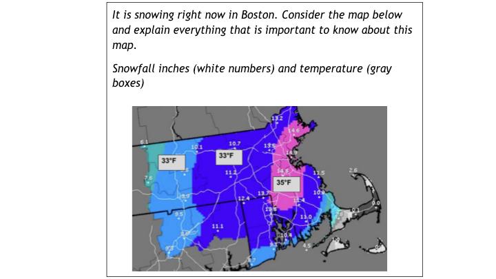Example 3 requires that students have prior knowledge in order to answer the question. Students would need to know about weather fronts, the relationship between temperature and snowfall, and that a body of water can influence the amount of precipitation that occurs in a coastal area. This prior knowledge can act as a barrier; making it difficult for a student to communicate their thinking if they are not aware of what influences the weather map. Despite this prior knowledge barrier, example 3 is an open ended question that tends towards the student affect - students are asked to explain everything that THEY believe to be important, in contrast to being asked to solve for a prescribed correct answer. A question like example 3 would be a good question to give to students after they had learned about the aforementioned weather concepts as a way to learn about what they forecast based upon a weather map.