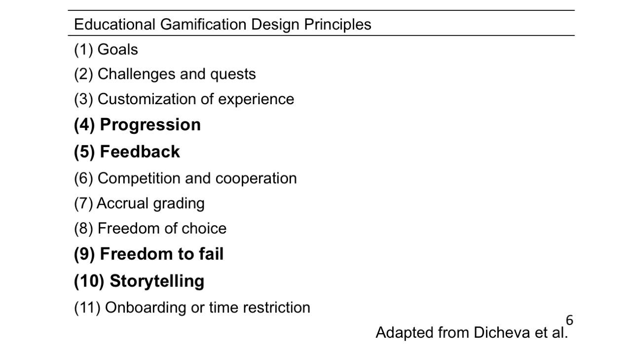 In a 2015 systematic mapping review, Dicheva et al. identified eleven educational gamification design principles.7 However, not all of these principles may be of equal usefulness. In another study of the relevant research, Stott and Neustaedter suggested that four of these design principles (figure 2) were most consistently successful in educational contexts8 including: 1. Freedom to Fail, 2. Rapid Feedback, 3. Progression, 4. Storytelling.