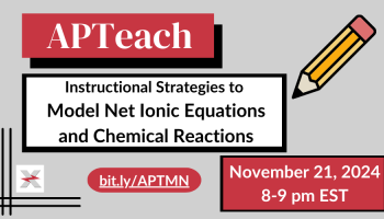 The November 2024 APTeach presentation outlined instructional strategies to model net ionic equations and chemical reactions using particulate models, chemical symbols, and observations to support students’ understanding of how chemicals react and interact at the particle level.