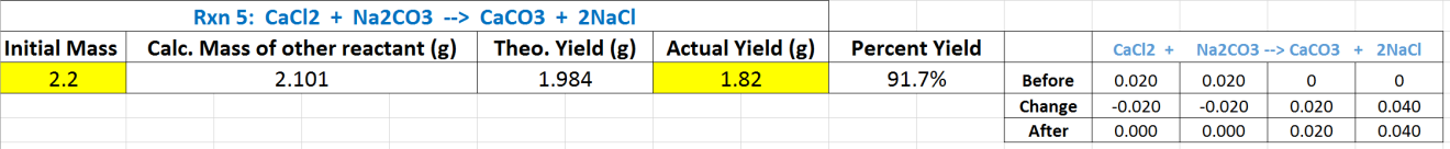 4. Students must use their recent understanding of mass/mole conversions and BCA tables to calculate how much of the other reactant they will need to ensure no leftover reactants as well as their theoretical yield.