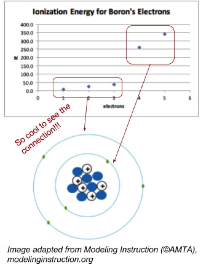 To get students to think about not just what electrons are present but where they are, and the fact that they are different, I adapted some materials from POGIL and the Modeling Instruction curriculum. First, students explore a POGIL1 on coulombic attraction to determine the major factors that affect the force of attraction between protons and electrons: distance and quantity. The next day, students applied this to data about ionization energy, trying to figure out how the ionization energy (a proxy for force of coulombic attraction) can give insight into the positions of electrons. In small groups with guiding questions, they start to uncover that a high ionization energy must indicate electrons that are close to the nucleus, and that the different groups of electrons they see in the data must reflect different positions. (This also nicely coincides with students’ work with piecewise functions in Algebra II.)
