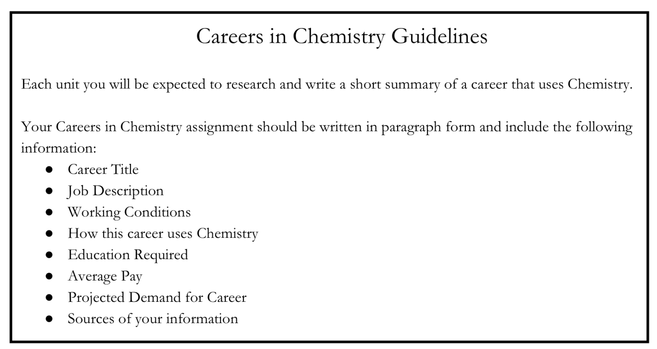This year I started asking students to complete a simple assignment at the end of every unit that has come to be known as “Careers in Chemistry”. The purpose of the assignment is to expose students to career options that use Chemistry that they may not know much about.