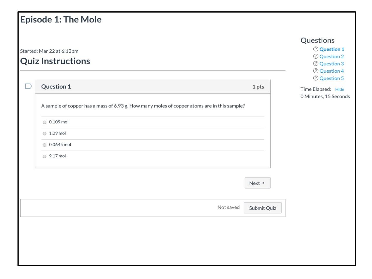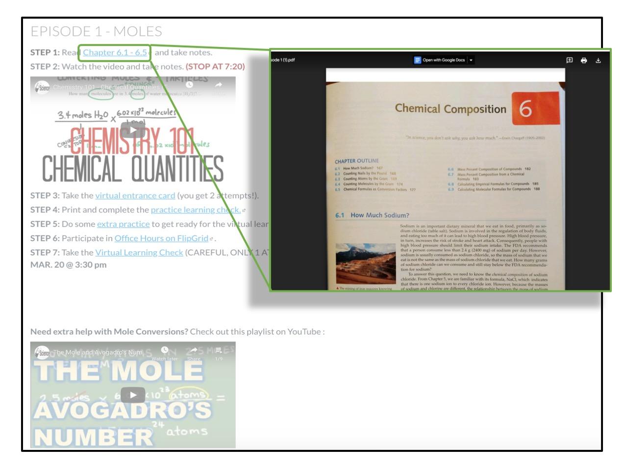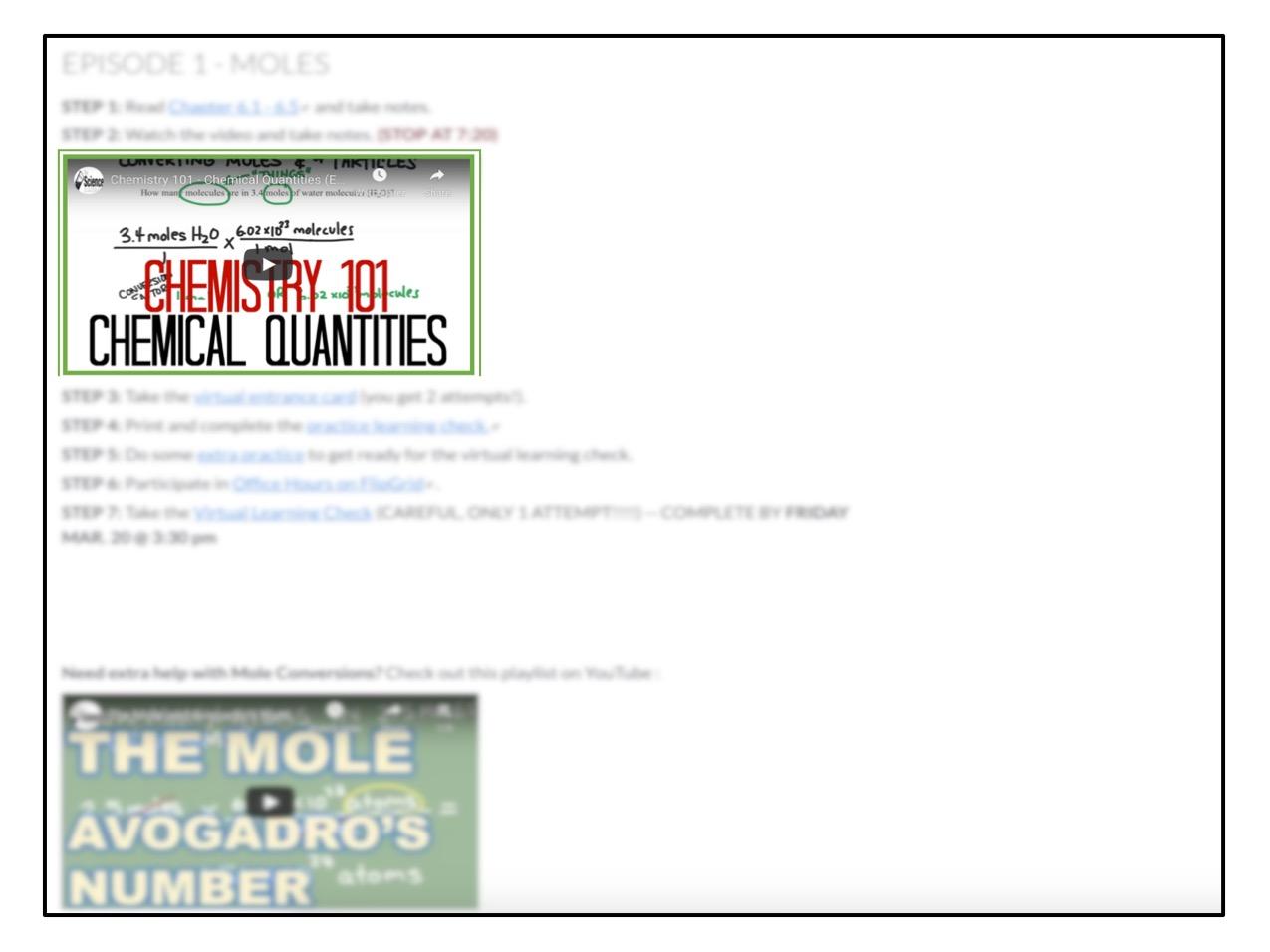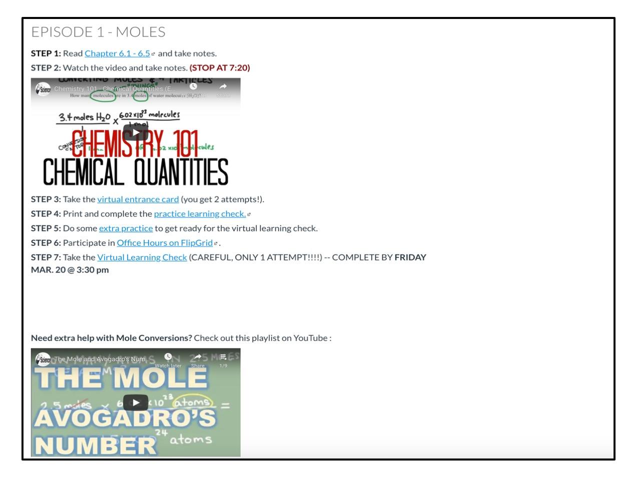 Actually, I quickly realized that I am moving too fast with this plan! Originally, I thought that moving the mole/stoich unit into a 5 week Virtual Course should be pretty manageable for students; however, it wasn't. I'm still reworking the course.. but I've started to break the episodes up into smaller chunks. Things just take longer in this virtual learning environment.