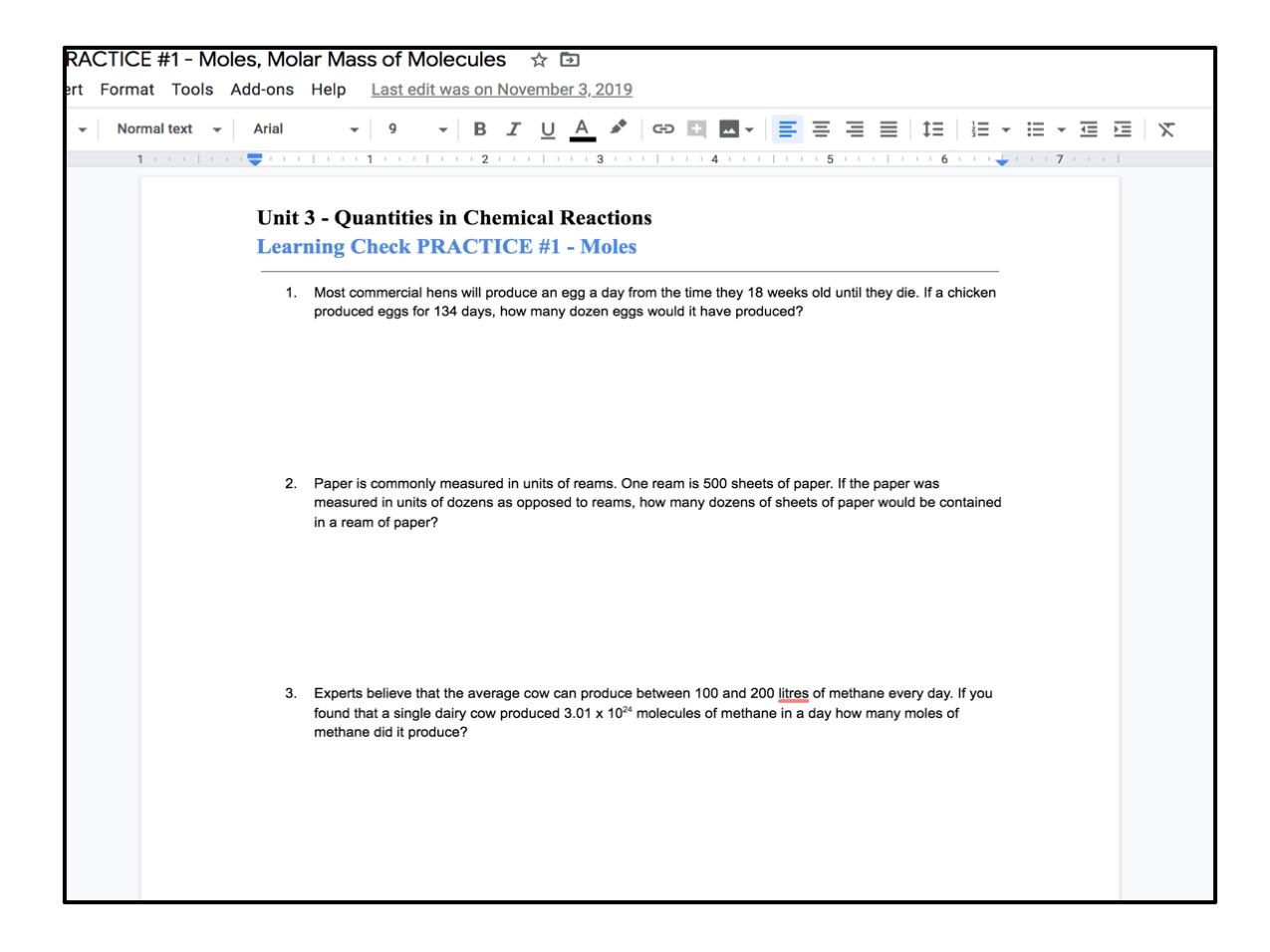 Of course, practice is vital for learning a topic in chemistry, especially stoichiometry. In my online course, students are assessed at the end of the “episode” with a quiz (I call it the Learning Check), so I created a practice Learning Check to help them prepare. Additionally, I selected questions from the textbook, which I scanned and uploaded since I didn’t expect all of the students to have their textbook.