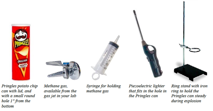 In the exploding Pringles can design challenge, students are tasked with making a controlled explosion inside of an empty Pringles can in order to produce the maximum “boom.” Using the simple materials list displayed in Figure 1 below and safety precautions, students are encouraged to brainstorm and plan prior to experimentation. The activity requires a laboratory setting (with proper safety precautions) and about two hours of time; either as a single two-hour laboratory session, or as shorter laboratory sessions over several days. Students are directed to navigate the process in design cycles, in which they first brainstorm and plan what to do, then try it, and then consider the results before continuing with the next cycle. PDF documents detailing safety protocols and student handouts are available from our ChemEd X collection. The exploding Pringles can design challenge has been tested in high school chemistry classrooms in the US, and in university chemistry classes in the US, Mexico, and Costa Rica.