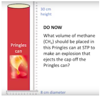 Not only is the exploding Pringles can design challenge a laboratory experience, but it is also a formative assessment that provides teachers insights into how their students think about using chemistry to control a reaction. Contrast this to typical formative assessments where students are given specific directions and cues leading them to arrive at the “right answer” for the lab. Consider the image in Figure 2 below, where a similar problem clearly cues the student that they will need to use their knowledge of mole ratios, volume calculation, and the ideal gas law based upon the information given in the problem. In this more traditional formative assessment, teachers are more likely to examine their students’ work through the lens of evaluating the correctness of student responses, in part because the problem has one correct answer. For example, teachers might notice whether a student correctly or incorrectly balanced the chemical equation for the combustion of methane, calculated the volume of the can using the correct geometric formula, or performed a calculation using the ideal gas law using the temperature and pressure values provided.