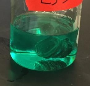Students add small amounts of aluminum to displace the copper from solution. As the solution returns to a colorless liquid, students remove any unreacted aluminum and decant the fluid. The resulting copper is washed with distilled water and transferred to a watch glass. The product is dried in the drying oven and mass when cool and dry.