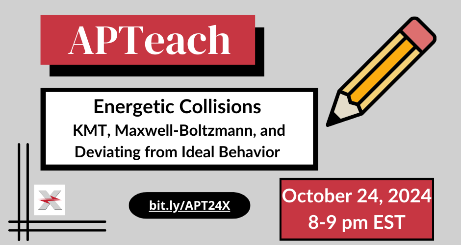 APTeach - Energetic CollisionsIn our next AP Teach meeting, join us to discuss Kinetic Molecular Theory, Maxwell-Boltzmann curves, and why gases deviate from ideal predictions. REGISTER NOW for the October 24th APTeach Session! |
