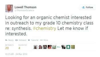 I've mentioned previously that my current grade 10 class is reading "The Case of the Frozen Addicts" together. As my students starting writing their blogs to respond to the reading, I saw quite a few questions that I couldn't answer. But I didn't want to leave the questions there with no response, so I went to Twitter to find scientists to join my class as a guest speaker.