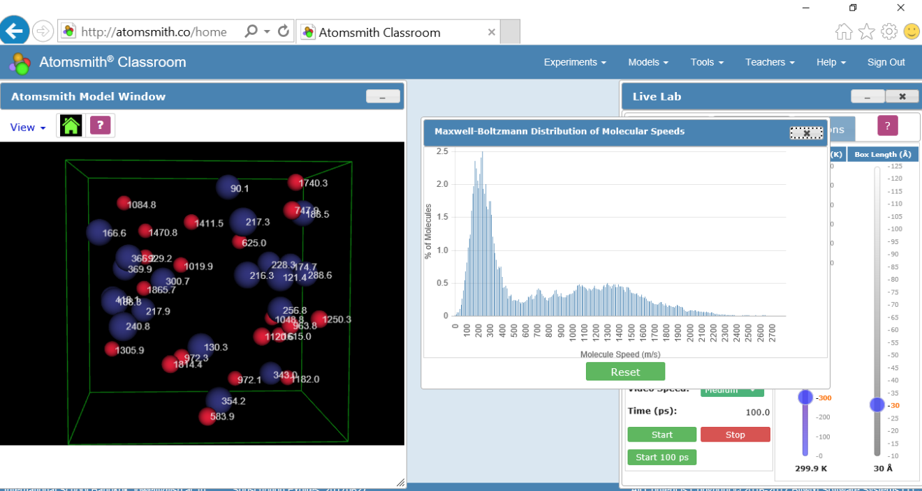 There is an entire collection of activities and experiments provided that can be used to guide the students through a number of topics. One characteristic of Atomsmith that I've always admired is the interactive nature of the company. I've had many interactions through Twitter and email with Dave Doherty, and some of these have led to new features. For example, Atomsmith Classroom Online now includes a Maxwell-Boltzmann distribution option when looking at a group of molecules in the Live Lab. Below is a screenshot using a sample of 20 atoms of helium and 20 atoms of xenon, showing the Maxwell-Boltzmann distribution of speeds after 100 picoseconds of simulation. The particles can also be labeled with their speeds, as shown here. That can get a bit crowded, but by pausing the simulation and moving the box around I was able to find the speed of each particle.